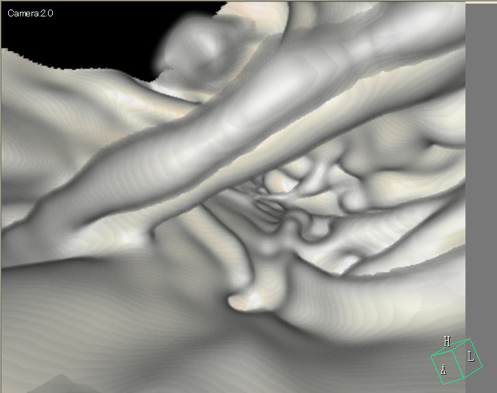 3次元再構築を行い、内視鏡モードで見ています(右の内耳道付近 外側から観察)。手前が第8脳神経(内耳神経)、奥が第7脳神経(顔面神経)、左が内耳道方向、右が小脳方向。奥に前下小脳動脈も見える。